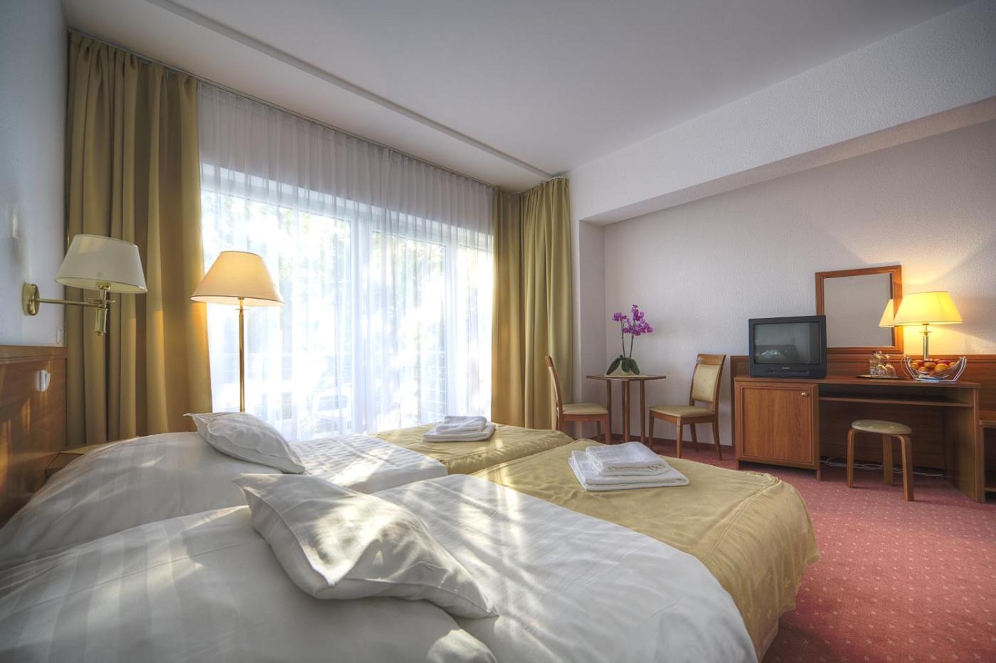 All rooms of the Két Korona Konferencia és Wellness Hotel provide a balcony, en-suite bathrooms with bathrobes and cable TV. Some rooms are air-conditioned.